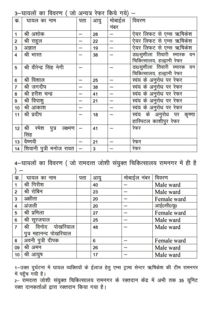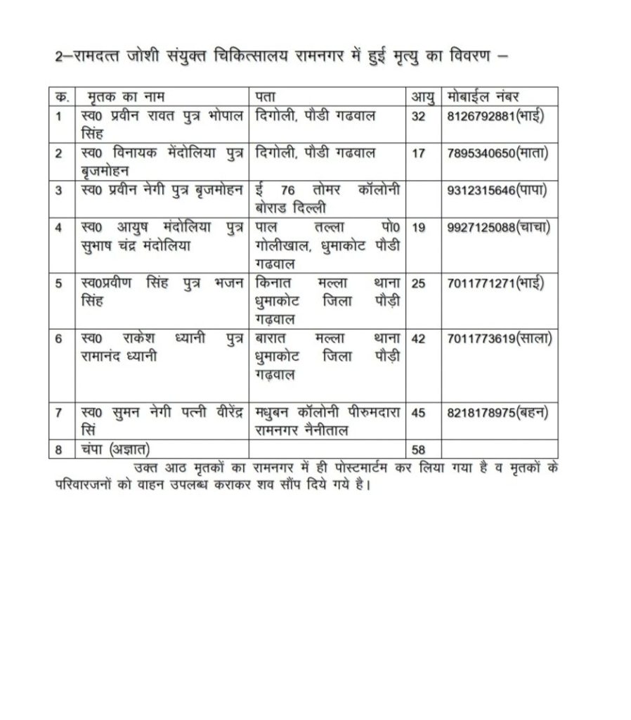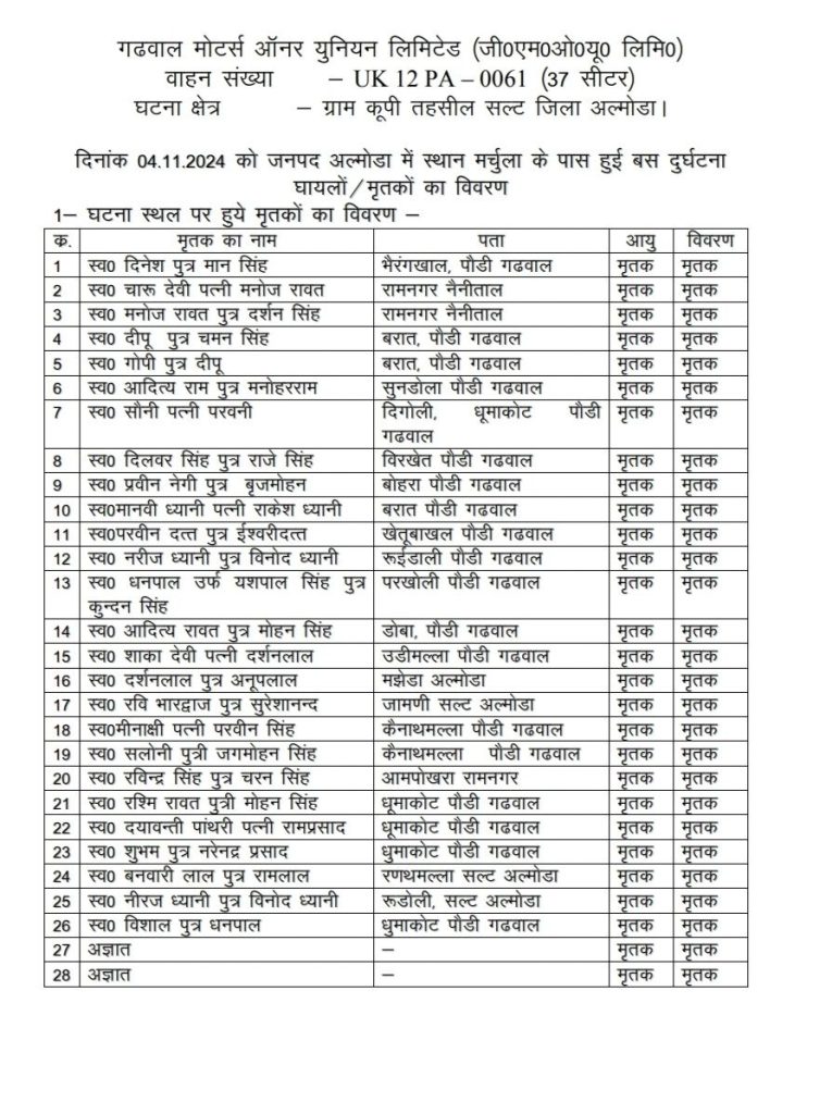 अल्मोड़ा जिले के सल्ट में सोमवार की सुबह हुई बस दुर्घटना में मरने वालों की संख्या 36 पहुंच गई है। प्रशासन से मिली जानकारी के अनुसार 28 लोगों की मौके पर ही मौत हो गई, जबकि आठ लोगों ने रामनगर अस्पताल में उपचार के दौरान दम तोड़ दिया। तीन मृतकों की पहचान नहीं हो पाई है। 10 घायलों का उपचार रामनगर अस्पताल में चल रहा है, जबकि गंभीर रूप से घायल 14 लोगों को अन्यत्र रेफर किया गया है। बस चालक ने लापरवाही की हद पार कर दी थी। 43 सीटर बस में 60 लोग सवार थे। बताया जा रहा है कि हादसा ओवरलोड होने की वजह से हुआ। बस की कमानी का पट्टा टूटा हुआ पाया गया है। इससे अनुमान लगाया जा रहा कि पट्टा टूटने की वजह से बस असंतुलित हुई हो। बरहाल हादसे की असल वजह मजिस्ट्रेटी जांच के बाद ही सामने आएगी।