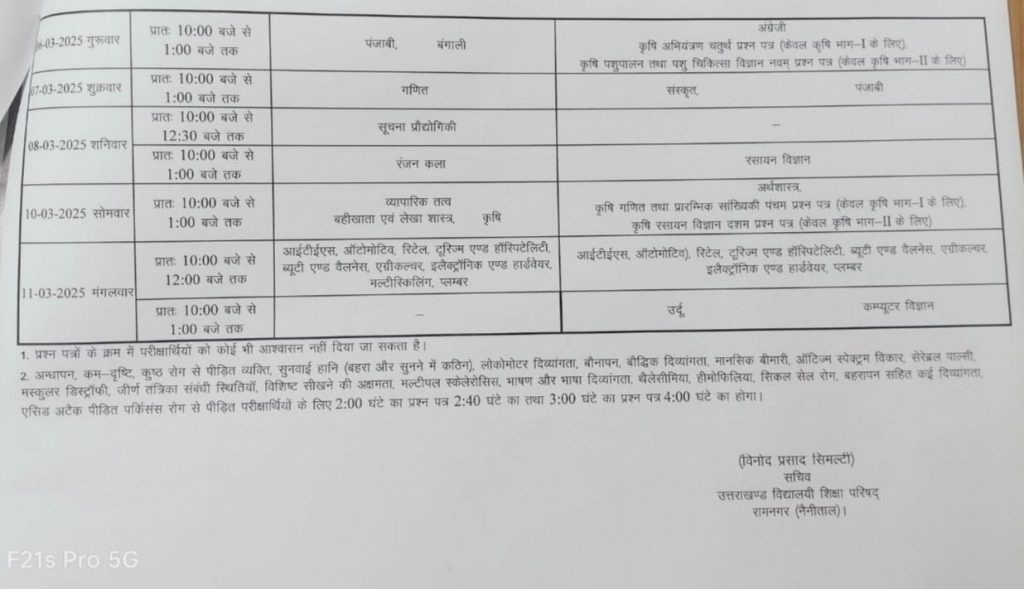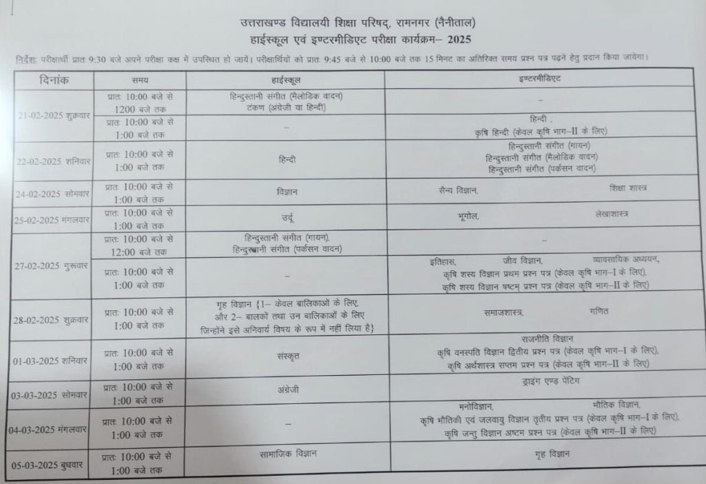 उत्तराखंड बोर्ड परीक्षा का टाइम टेबल जारी होने का विद्यार्थियों को लंबे समय से इंतजार था। उत्तराखंड विद्यालयी शिक्षा परिषद ने शनिवार को परीक्षा कार्यक्रम जारी कर दिया। बोर्ड परीक्षाएं 21 फरवरी से शुरू होंगी। 19 दिन में परीक्षाएं संपन्न हो जाएंगी।